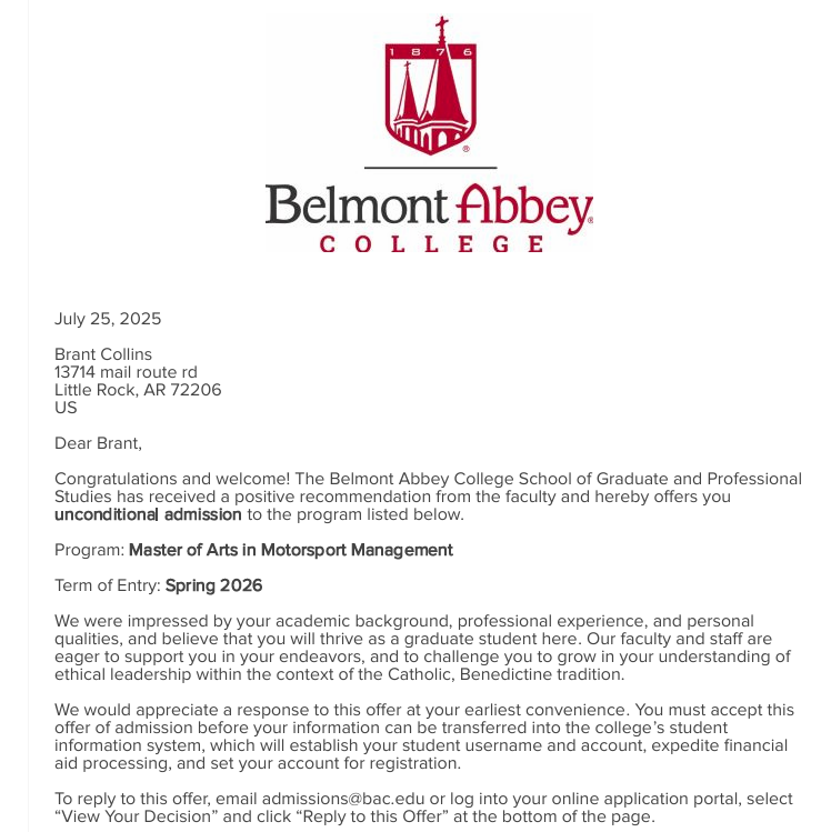 Then—because Facebook is always listening—an ad popped into my feed: Master of Arts in Motorsport Management at Belmont Abbey College. It’s the first graduate program of its kind in the U.S., focused on everything from sponsorship and marketing to team operations and governance within motorsports. I filled out the form, got a call from the program director the same day, and the next day we spoke. It checked all the boxes: online, flexible, and they’ll even transfer in some of my old grad credits.